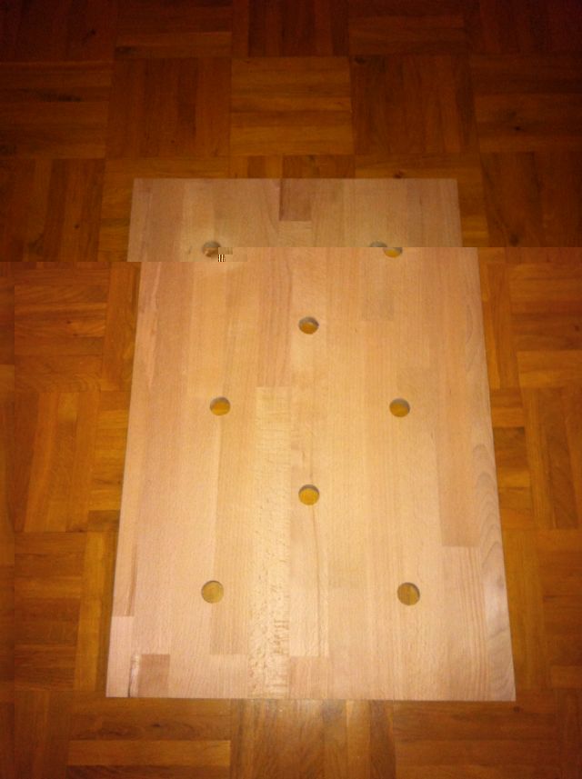 Nun, wie ihr sehen könnt sind die Löcher schon gebohrt. Mit so einem billigen, flachen 22mm-Bohrer, den ich nicht empfehlen kann. Man sollte lieber tiefer in die Tasche greifen. Aber was solls, aus Fehlern wird man klug.