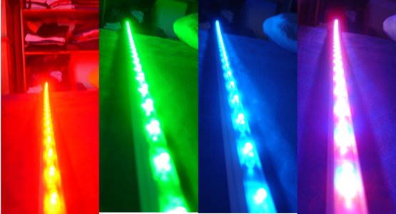 Auf dem Bild sieht man auch noch das RGB Steuergerät welches jeden Kanal in 8 Bit Auflösung dimmen kann (max. 2.5 A Last pro Kanal). Es verfügt auch über einen Infrarot Empfänger, so dass ich per Universalfernbedienung verschiedene Farbabläufe wählen kann. Es ist mit der Fernbedienung auch möglich, jeden Kanal mit 3 Bit Auflösung einzustellen. Ich gebe jetzt den genauen Typ der beiden Geräte nicht an, will ja schliesslich keine Werbung machen, wer sie finden will, wird sie finden.