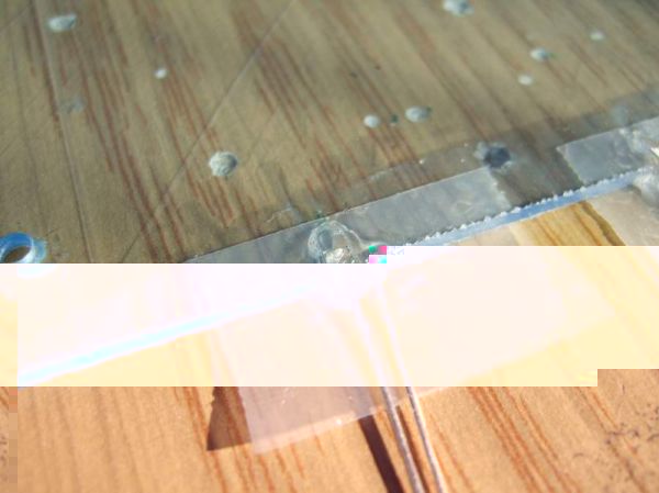 Auf dem nachfolgenden Bild könnt ihr zum einen die Grünen Striche sehen, ich habe dort markiert wohin die LEDs später strahlen sollen. Des Weiteren habe ich dann mit einen Abstand von ca. 6mm vom Rand, 3mm Löcher gebohrt. Danach habe ich, mit einer kleinen Metallsäge, die Verbindung zum Rand hergestellt. Als nächstes habe einen Streifen Tesa zwischen die Schutzfolie und das Plexi geklebt.