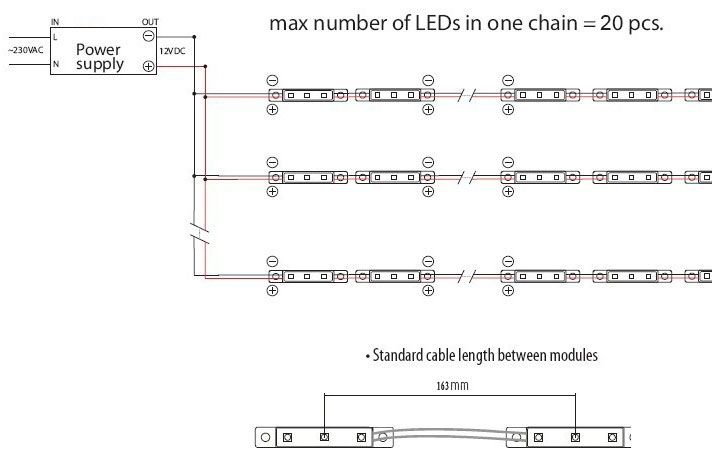 Woher stammt die Angabe "max. number of LEDs..." in der Skizze ? Von uns ist die doch nicht... ? Es sind 15 Module pro Strang, und ein Strang ist 1m lang. Du kannst mehrere Stränge und somit definitiv mehr als 20 Module in einem Strang betreiben. Natürlich kann man alle x Module neu einspeisen, das ist gar kein Problem. Alle weiteren Fragen : ebenfalls ja. Mit + und - raus in die Module, und die Stränge dürfen auch unterschiedlich lang sein. Bei einer Parallelschaltung - und darum handelt es sich ja, egal wie "lang" die Strippe wird - bleibt es bei der Spannung 12V, während sich der Strom pro Modul um 16,6mA erhöht. Wenn du ganz sicher gehen möchtest, dann ruf doch mal die Technik an : 07471-96014-75. Dann ist das sicher schnell geklärt.