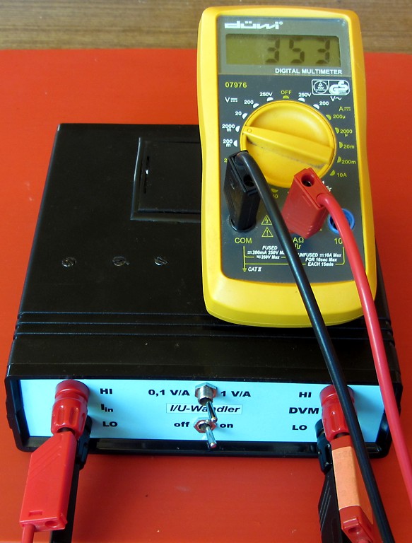 Hier wird ein Strom von 350 mA gemessen: Der I/U-Wandler steht auf 1V/A, das DVM im Messbereich 2000mV. Die Anzeige erfolgt folglich direkt in mA. Bei Multimetern mit einem 2V-Messbereich würde ein Wert von 0.353 angezeigt werden, die Anzeige erfolgt dementsprechend in A.
