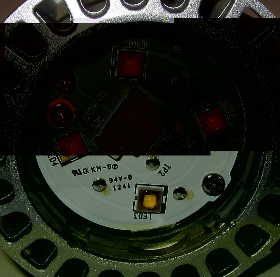 Ein weiteres Freilegen der KSQ wäre zwar mit einem Dremel und entsprechenden Aufsätzen möglich, aber mit einem sehr großen Zeit- und Arbeitsaufwand verbunden. Deshalb habe ich darauf verzichtet. Im Betrieb habe ich zwischen TP1 und TP2 auf der LED-Platine eine Spannung von 11,55 V gemessen. Damit liegt die Vorwärtsspannung der LEDs bei 2,9 V. Anhand der Effizienz der LEDs (121 lm @ 350 mA) und der erzielten Lichtleistung kann man eher von einer mäßigen Effizienz der KSQ ausgehen.