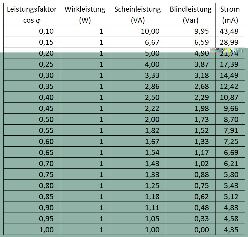 Herausgekommen ist zunächst eine Tabelle bezogen auf 1 W Wirkleistung: