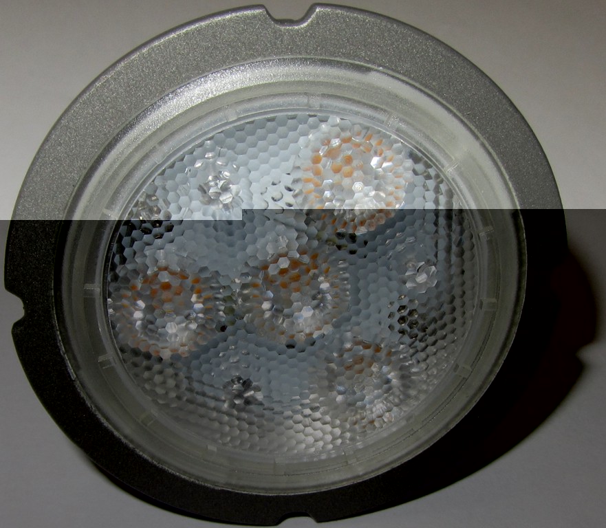 Auch bei dem LG-Strahler ist die Spotwirkung eher weich. Die Frontabdeckung besteht ebenfalls aus 2 Teilen, ist allerdings nicht ganz so einfach zu lösen: