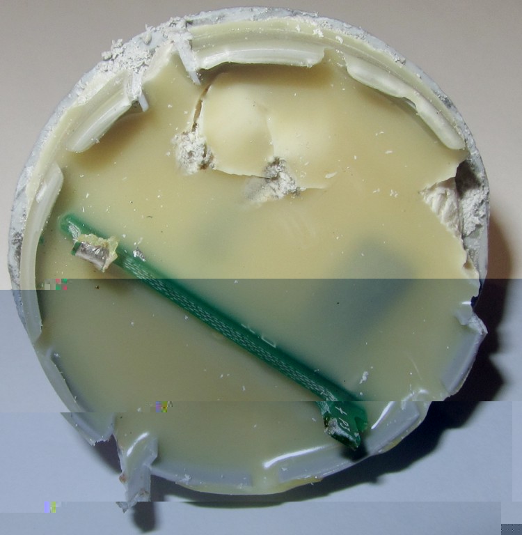Das Netzeil ist komplett vergossen. Glücklicherweise ist die Vergussmasse relativ weich und lässt sich relativ "einfach" mit einem Skalpell schneiden. Also habe ich zunächst das restliche Gehäuse mit Dremel und Trennscheibe stückweise entfernt, anschließend die Vergussmasse so weit wie möglich mit dem Skalpell entfernt und die Reste weitestgehend mit Dremel und Drahtbürstenaufsatz entfernt. Dabei sind natürlich die Beschriftungen (und - auf der Unterseite - wohl auch ein SMD-Bauteil) verloren gegangen. Hierbei ging´s mir aber auch nur darum, herauszufinden, um was für ein Netzteil es sich handelt. Ergebnis: