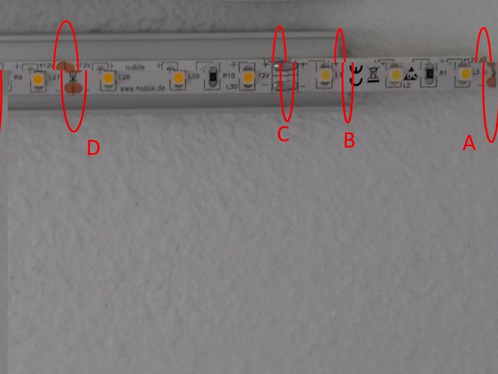 Daher die Frage: was genau passiert, wenn ich ihn bündig abschneide (rotes B)? Wieviele bzw. welche LED werden danach nicht mehr leuchten? (ausgehend von D oder C).