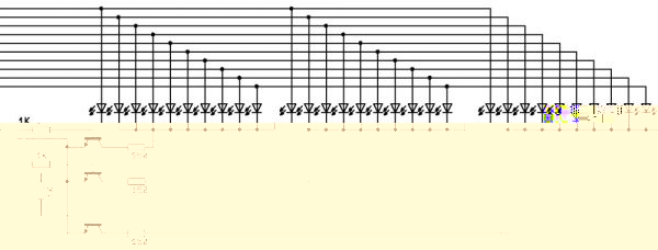 Die Masse der ersten Ledreihe wird freigeschaltet, dann noch die erste obere Leitung freischalten. Dann leuchtet die 1. Led der ersten Ledreihe. Soweit so gut.
