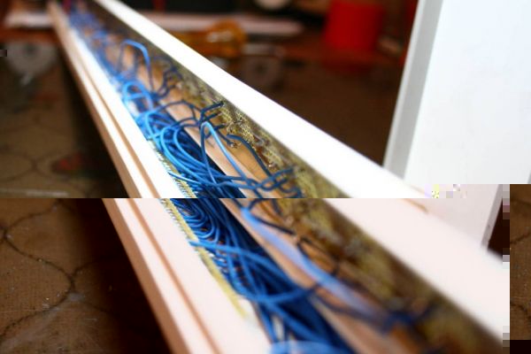ich hab einfach normale europlatinen in streifen geschnitten, 6x3 leds draufgelötet und dann immer 3 stück in reihe geschaltet. von diesen streifen hab ich 8 stück dann einfach mit 2komponentenkleber in nen kabelkanal geklebt. davor natürlich alle 22,6mm ein 15mm loch gebohrt. angeschlossen hab ich das dann an der widerstandsplatine mit 0,5qmm litze. widerstandswerte waren für rot 240Ω, grün 120Ω und blau 82,5Ω. die widerstandsplatine liegt lose in der mitte vom kabelkanal, 48 kabel halten das schon an ort und stelle. als steuergerät verwende ich chromoflex 2,5A.