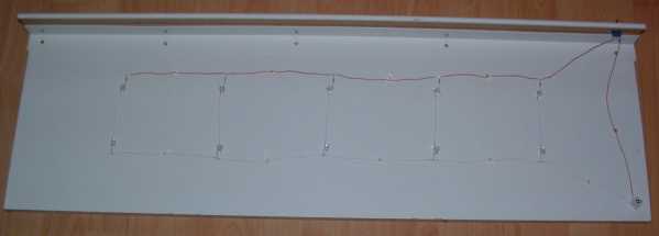 Allerdings wollte ich kein Flutlicht, sondern nur ein bißchen Licht, Ich hab´ 10 weiße Superflux genommen, je2 in Reihe mit einem 220 Ohm Vorwiderstand an einem 6V Steckernetzteil.
