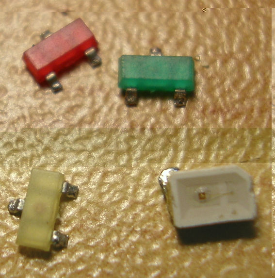 Darunter: Die PLLC LED. Eine Mehrchip-SMD-LED, bei der alle 4 Chips einzelne Kathode und Anode haben! Das hat den entscheidenden Vorteil, daß man sie in Reihe schalten kann.