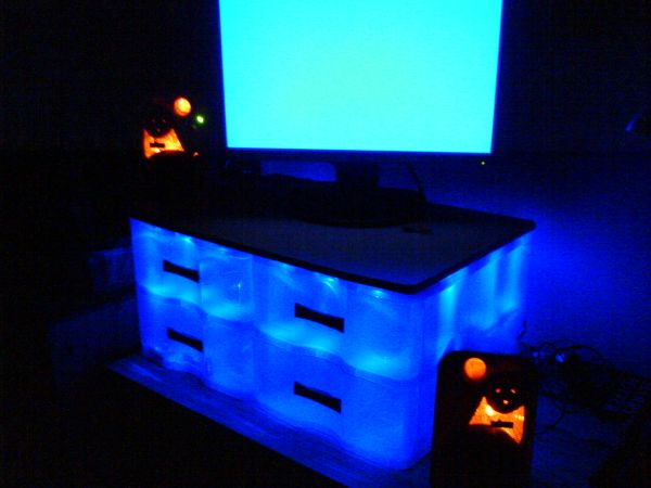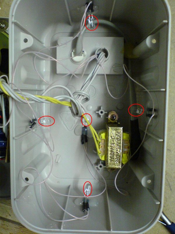 So hab schon wieder ein Projekt fertig. Meine Computerboxen sahen recht langweilig aus. Also was eignet sich besser als LED´s zur Verschönerung. Damit es aussieht als würden sie brennen habe ich mich für orange LED´s entschieden. Zusätzlich zu dem einen großen Loch an der Oberseite habe ich eine weitere Öffnung unter das Gitter gefräßt. Dazu habe ich einen Dremel benutzt. Als Stromversorgung habe ich gleich die Boxenversorgung angezapft. Nach den Gleichrichtern liegt eine Spannung von ca. 13,5 V an. Da habe ich pro Box 5 LED´s in Reihe geschaltet und diese beiden Rehenschaltungen auf einer Platine Paralell geschaltet davor dann noch einen 100 Ohm-Widerstand. Außerdem habe ich einen Schaler integriert damit ich wenn es hell ist die Beleuchtung ausschalten kann. Ich denke man kann diese orangen LED´s auch gut als Halloweenbelauchtung füt Kürbisse nehmen.