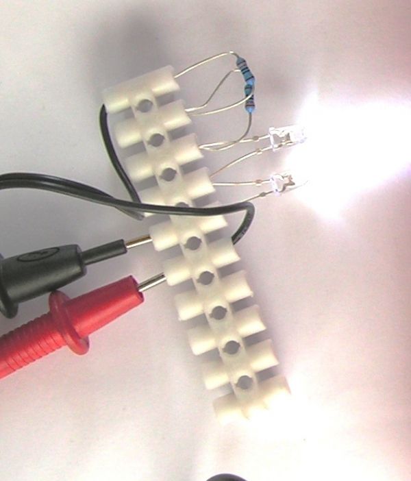 Also glauben wir mal dem Multifunktionsmeter und berechnen die Vorwiderstände für zwei in Reihe geschalteten LEDS