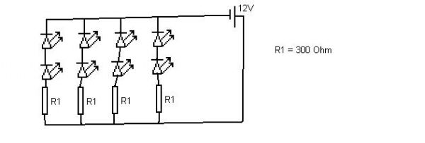 ich habe leds in rhei geschaltet immer 2 stück... so also ich hab blaue LEDs... hab mal nen plan gemacht