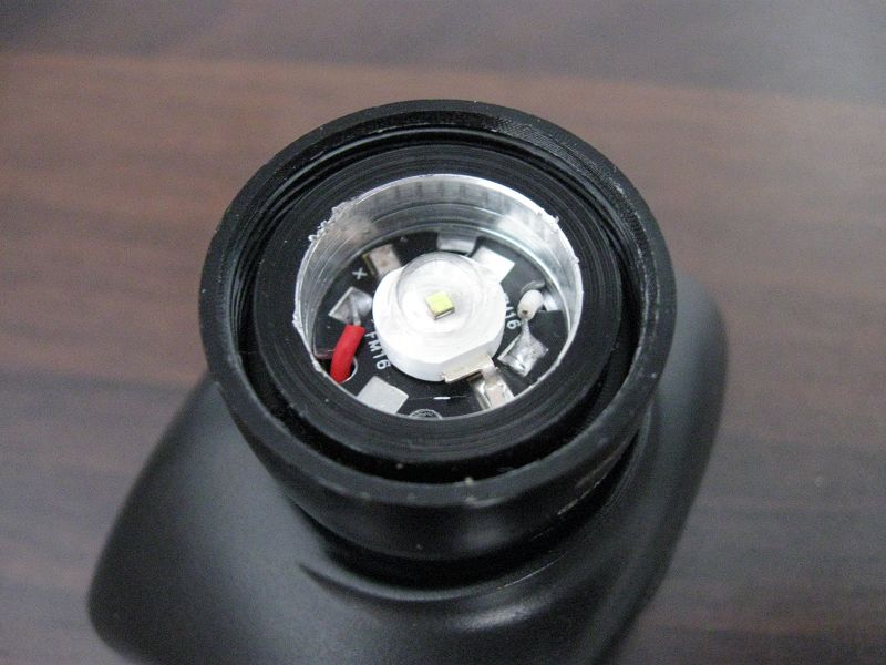 Wenn man die Linse abschraubt sieht das ganze so aus: Der LED-Chip ist mit 2 Nasen auf eine kleine Platine gelötet die in einem Alugehäuse sitzt. Auf der Platine steht FM16 und laut Beschreibung soll eine CREE Q5 verbaut sein. Wenn ich aber nach "CREE Q5" google sieht die vom Aufbau her ganz anders aus.