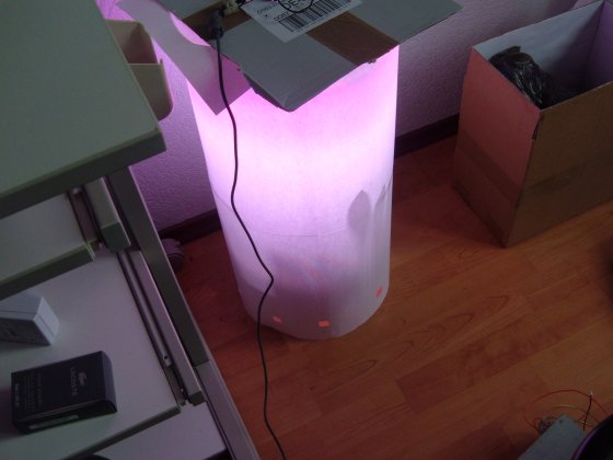 Kleines Update:Da die Pflanze immer grösser wurde und ich möglichst wenig Licht an den Seiten verlieren wollte habe ich mal schnell aus Tesafilm und 8 weissen Din-A4 Blättern eine Tonne Gebaut die das Licht wieder zurück auf die Pflanze wirft.