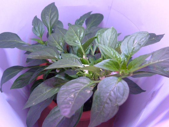 Hier meine Chilipflanze.Da bei uns in den letzen 2 Wochen kaum Sonne da ist steht sie unter der Ledlampe mit je 8 Cree XR-E,4 Royalblau K2 290mw@350ma und 3 K2 Rot.
