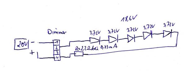 Das heißt also ich verbinde die 5 P4`s ( 5X 3,72V = 18,4 bei 20 V rest 1,6/2,2Ohm 5Watt =0,73mA) in reihe und löte den Widerstand ( 2,2Ohm ) ein damit die max leistung von ca. 730mA nicht überschritten wird, und dann in reihe an den minus den Dimmer, oder?
