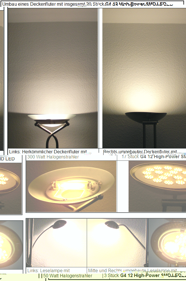 Auch ich habe einen 300Watt+50Watt Deckenfluter auf LED's umgebaut. Dieser ist jetzt heller als mit Halogenleuchtmittel. Ich bin dabei aber einen anderen Weg gegangen.
