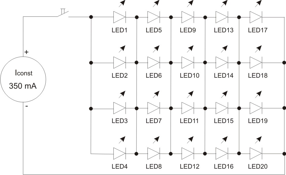 Anschließend habe ich die LEDs in einer Art Matrix folgendermassen verdrahtet: Vorteil dieser Schaltung ist, dass sich leichte Unterschiede der Ströme in den einzelnen LEDs nicht addieren können. Da immer 4 LEDs parallel geschaltet sind, fließen im jeweiligen Knotenpunkt auch immer wieder die 350 mA, die sich dann auf die folgenden 4 LEDs wieder aufteilen. Rein rechnerisch fließt durch jede LED ein Strom von 87,5 mA. Daraus ergibt sich ein Lichtstrom von ca. 1100 Lumen.