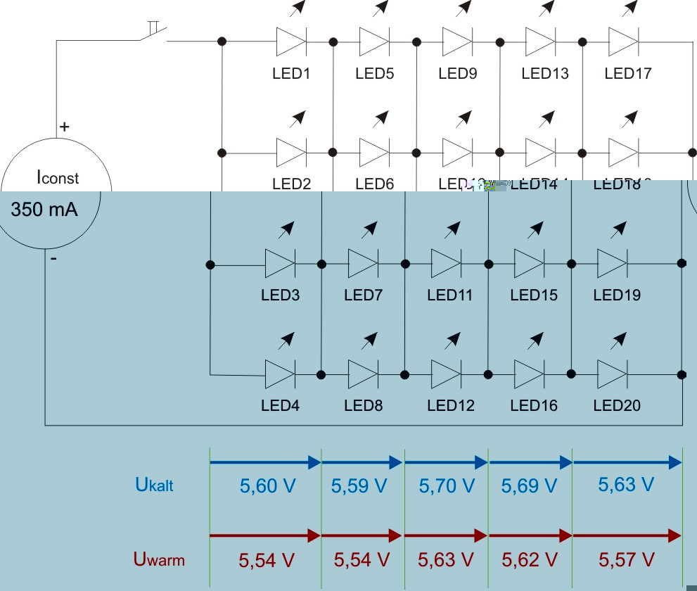 Hinweis: Die Parallelschaltung der LEDs 17 bis 20 besteht aus 3 LEDs der ersten Lieferung und 1 LED der 2 Lieferung. Daraus ergibt sich die abweichende Spannung. Die resultierende Stromdifferenz ist optisch aber nicht sichtbar.