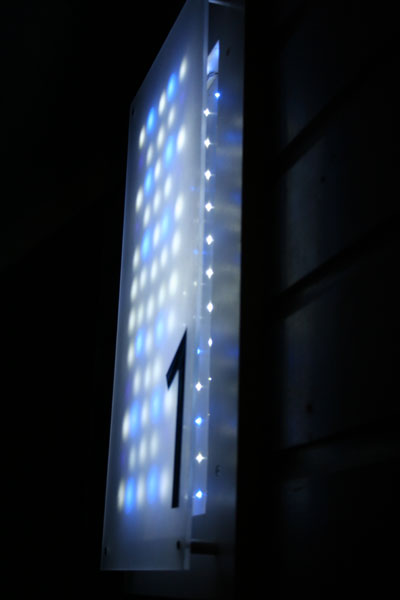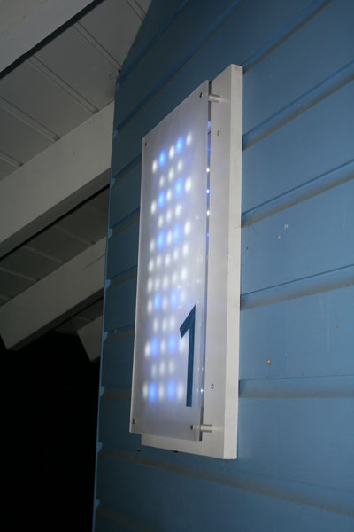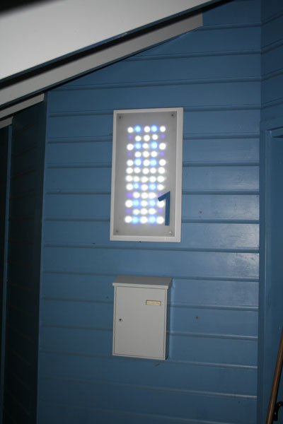 oder gleich die Abdeckung der Nummer in ner anderen Farbe als die Umgebung. An leuchtet dann nur die Zahl, aus und auch tagsüber sieht man dann den Farbkontrast.