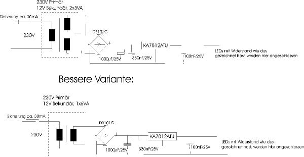 Heute würde ich nicht mehr so ein Netzteil Konstrukt selber machen, sondern würde Netzteile von Notebooks oder ähnlichem nehmen, weniger Risiko. Gebraucht sind die günstig. Leider bin ich erst jetzt auf diese Idee gekommen. Zudem flackert das Licht ein bissl, das wird wohl an der Trafo-Gleichrichterkonstruktion liegen.