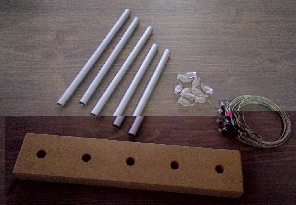 Neben der Tannebaum-Lichterkette, die aktuell noch nicht im Einsatz ist, standen auf der letzten Bestellung noch die batteriebetriebene Stern-Lichterkette und zehn gelbe LED-Teelichter mit drauf. Die wurden aber natürlich nicht ganz normal verwendet, sondern erstmal zerlegt: Geht recht einfach. Ist bis auf eine Schraube am Batteriefachdeckel alles nur gesteckt. Benötigen tue ich nur das Kerzenflammenimitat und die Flacker-LED. Letztere wird mit einem Stück Zwilligslitze plus 200 Ohm Widerstand versehen. Dazu noch abgelängtes 10mm Alu-Rohr und nen Holz-Fuß: Die Kabel laufen unten in einer eingedremelten Nut. Fertig eingefädelt siehts dann so aus: Nun noch die Kerzenflammenimitate aufstecken. Mit ihren flexiblen Haken lassen sie sich stramm in das Rohr drücken und brauchen keinerlei zusätzliche Befestigung: Die Lichterkette wurde nur von ihrem Batteriefach befreit und der nackten Parallelschaltung wegen mit großzügigem 22 Ohm Widerstand auf 5 mA pro LED an 5 V ausgelegt. Im Fenster siehts bei hellem nun so aus: Bild bei Dunkelheit könnte noch folgen, wenn ich mal dran denke