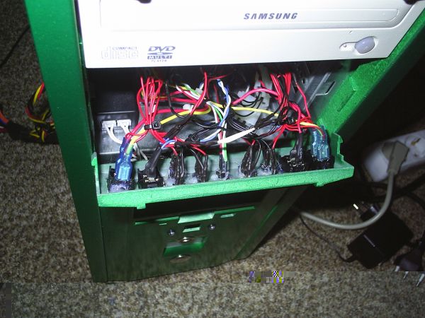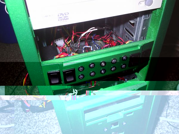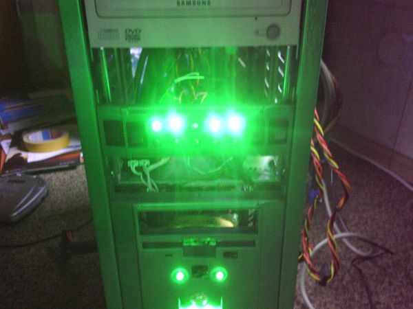 So hier wurde meine 5.25" Blende schon bearbeitet, also Löcher hinein für Schalter und Led's. Hatte da spaßenshalber mal leds rein *g* So hier erstmal beim lackieren, das ganze angeschliffen. Grundiert und die Farbe Grün/Metallic darauf. Versiegelt mit Klarlack. Ja dann habe ich erst einmal in jedes Löch einen Montagering und Led's rein gebaut sowie 4 Schalter, und dann sah das ganz so aus. Hier mal ein gebaut ins case. das ganze nochmal von hinten. So und hier das Ergebniss. Dabei leuchtet die obere Reihe immer, und die untere nur wenn was an ist. ihr seht das links und rechts immer nur 2 stück leuchten in der oberen reihe, und in der mitte 2 led's nicht leuchten, das liegt daran das das eine die Power led ist, und das andere Die HDD Led, und die waren jetzt nicht mit angeschlossen. Also jeder schalter hat immer 2 Led's