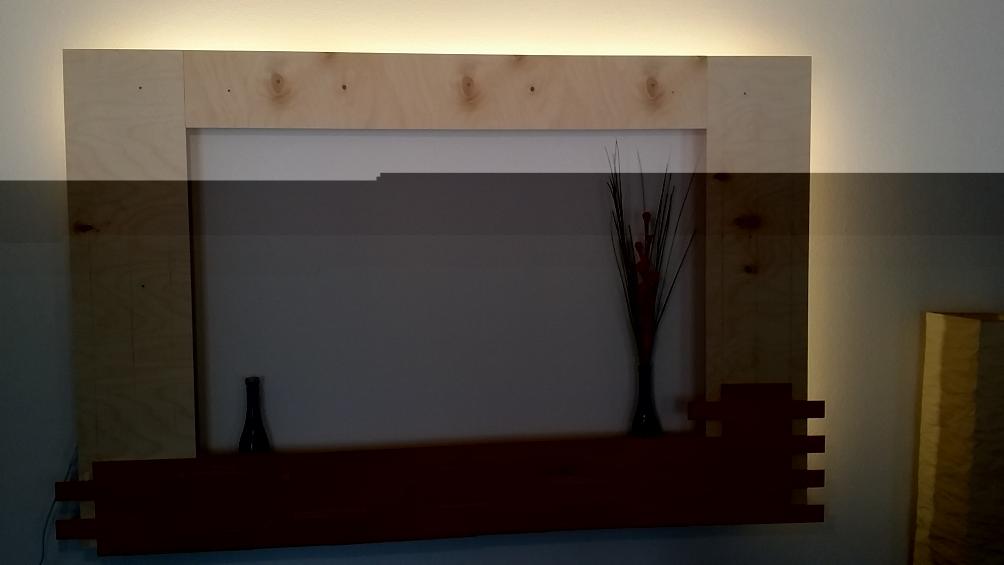 Ich baue gerade für mein Wohnzimmer einen Übergroßen Bilderrahmen für eine indirekte Wohnzimmerbeleuchtung (siehe Foto, das Foto wurde mit einer alten 3m-LED-Kette gemacht, die noch in der Wohnung herumflog).