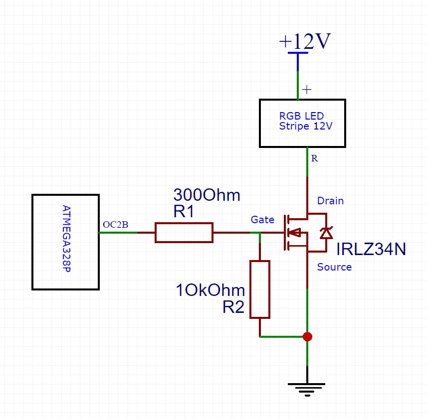 ich habe mittels ATMEGA328P eine Schaltung aufgebaut, um eine RGB-LED zu schalten bzw. faden zu lassen. Das funktioniert soweit ganz gut, also bin ich nun den Schritt von einer einzelnen RGB-LED (20mA, gemeinsame Anode) auf einen winzigen Abschnitt eines LED-Stripes (12V, gemeinsame Anode) gegangen. Dazu habe ich nun mal testweise einen IRLZ34N verwendet. Die vereinfachte Schaltung ist angehängt, wobei ich aber zwecks Übersichtlichkeit die Beschaltung des µC weggelassen habe.
