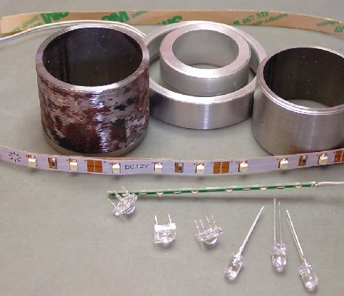Foto mit diversen LEDs und Metall Ringen verschiedener Durchmesser, der große Alu Ring