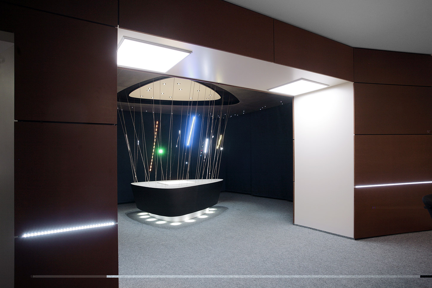 Falls Du im Showroom das meinst, was der Chef mit "Raumschiff" tituliert hat : das ist ein Drahtseilsystem, bei dem die Drähte unter Strom stehen und zwischen denen LEDs angeschlossen sind, das dient also dazu, LEDs in Aktion zeigen zu können. Ist nicht ganz so langweilig und konventionell, wie wenn man die Sachen einfach auf ne Holztafel an der Wand montiert... Unten und oben sind die LED-Paneele eingebaut und viele unserer HighPower-Spots.