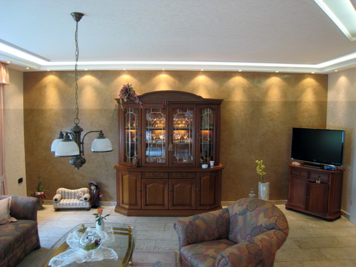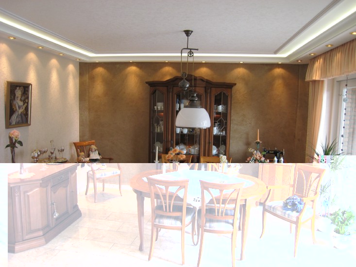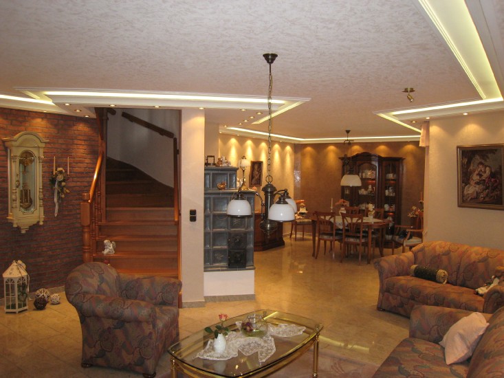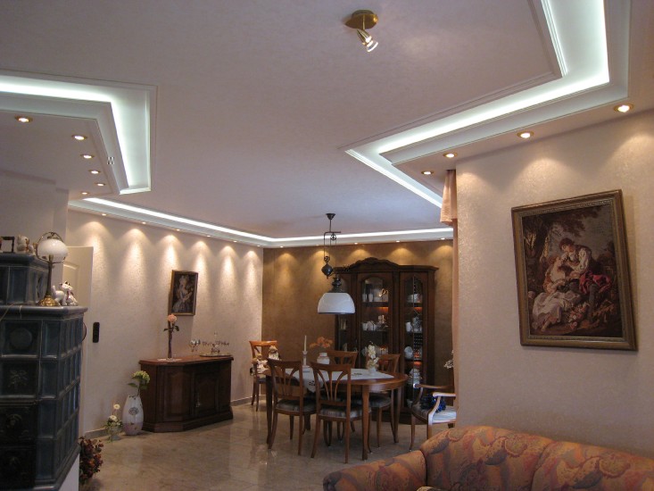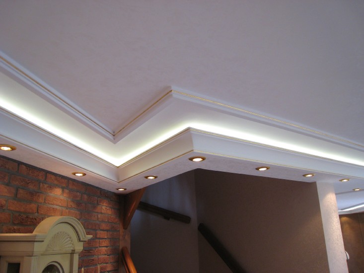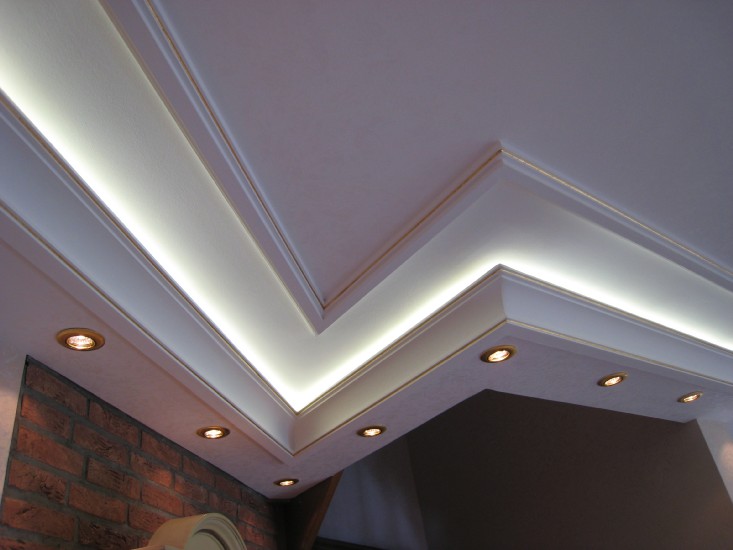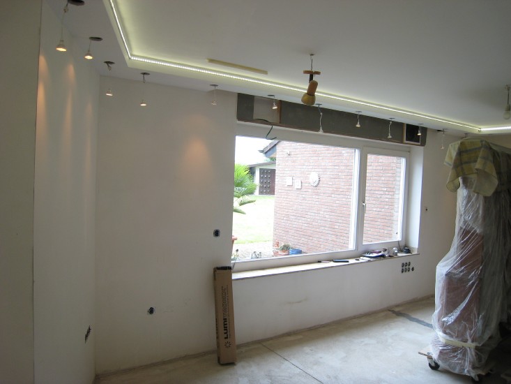 ich habe in meinem Wohn-Esszimmer 34 Meter Superflux-Leisten verbaut. Die Stuckleisten lassen ober 3cm Platz für den Lichtschein an die Decke zu lenken. Eine zweite kleine Stuckleiste blockt das Licht sodass der Eindruck eines Lichtbandes entsteht.