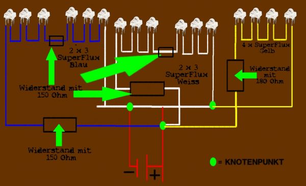 Warum malst Du so schöne Bildchen von der Verschaltung der LED´s und baust dann die Schaltung anders auf? In deinem Schaltbild sind vier gelbe Superflux mit einem 180 Ohm Widerstand in Reihe. Hatte ich ja Anfang - so wie in der Zeichnung ( 3x blau , 3x weiss ubd 4 gelbe) Erst nachdem mir die gelben...