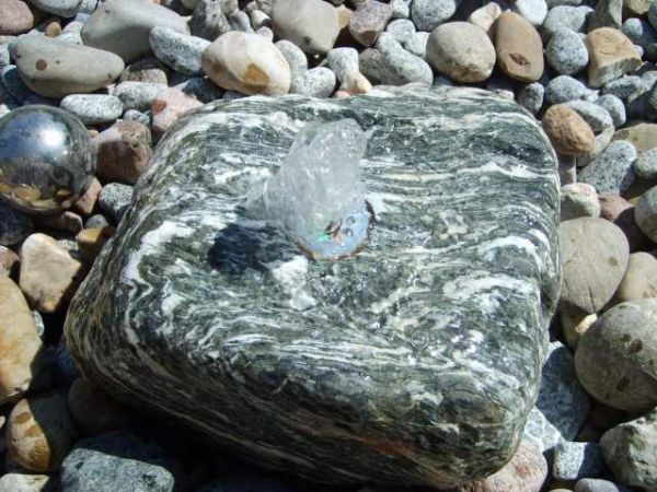 Loch im Boden, Speiskübel und Pumpe rein, Gitter Drüber, Quellstein mit loch über den schlauch stecken, LEDring am schlauch aufstecken, kiesel aufs gitter, wasser rein und freuen.