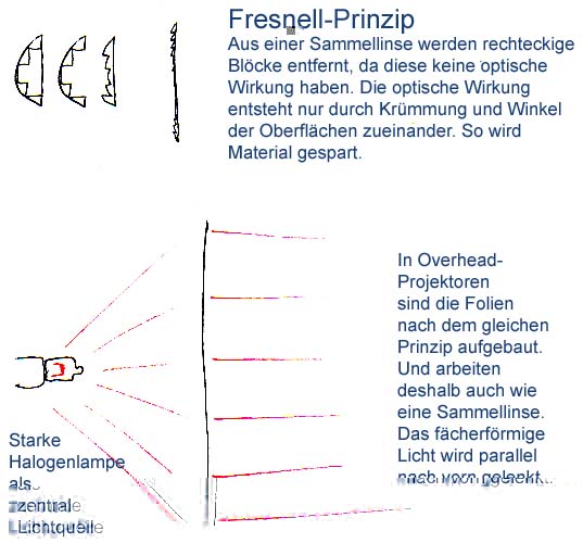 Diese Folien arbeiten nach dem Fresnell-Prinzip, sind also Sammellinsen. Denn der OHP hat eine dicke zentrale Halogen-Lichtquelle, deren Licht mit dieser Folie in eine gerade Richtung nach vorn gelenkt wird.braindeadx hat geschrieben:...die gleichmäßige Ausleuchtung, die ich so hin bekommen wie es schon bei OHPs gemacht wird. Ich weiß leider nicht wie man diese Scheibe oder Folie nennt...