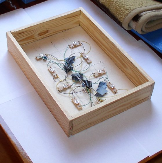 RGB Superflux bestellt, einen Rahmen aus Holz gebaut, LED's aller verlötet und getestet. Doch das Ergebnis war allerdings alles andere als zufriedenstellend. Ich hatte geplant eine Din A4 große Fläche mit den Superflux auszuleuchten in einem Abstand von etwa 6cm, aber die Ausleuchtung war nicht schön gleichmäßig geworden. Bei einem Abstand von etwas über 10cm sah das ganze schon wieder besser aus, allerdings wäre mir die Konstruktion dann einfach zu tief geworden. Also hab ich diese Idee erst mal wieder verworfen.