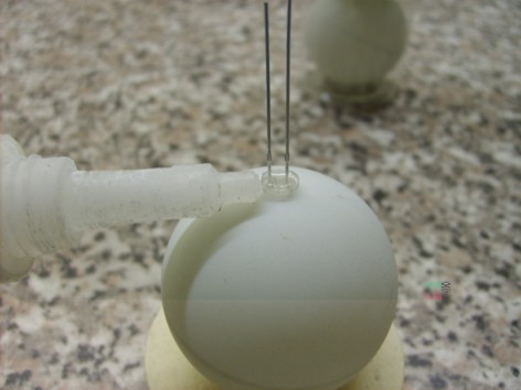 Nachdem die Bälle von ihrer Beschriftung befreit wurden, Bohrt man ein loch möglichst mittig von Oben in den Ball (Bohrung 4,5mm )