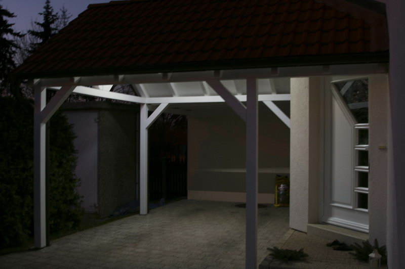 Also ich denke, Du benötigst schon einige LEDs und 150 EUR sind schnell zusammen. Ich habe bei meinem Carport eine Spar-Varinate gewählt: 16 1-Watt LEDs mit je ca. 40-60 Lumen nur und dazu eine 230V-KSQ. Teuer sind nochmal die Alu-Profile hier aus dem Shop, aber man kann da sicher auch etwas selbst bauen. Ich habe nicht so das Problem mit der Feuchtigkeit, aber bei Dir muss es ja auch wasserdicht sein. Hier noch ein paar Fotos.