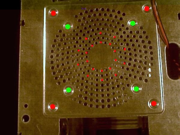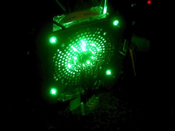 So da mir das irgendwie wenig erscheint, und da auch die Bestellung von Reichelt da ist, also seit gestern, habe ich mich mal ans werk gemacht, einen Art größeren Led Cluster zu bauen, und zwar so. Da wo die Grünen Punkte sind kommen keine Led's hin da dort die Lüfter bereits befestigt wurden