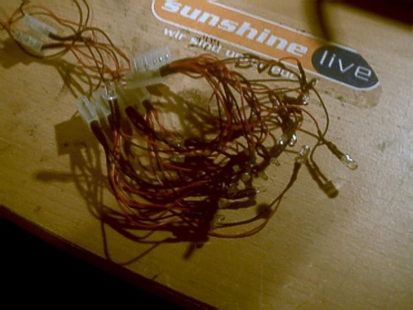 Auf jedenfall kommen insgesammt 24 Led's hinein, darunter 4x 5mm 15000mcd und 20x 3mm 15000mcd, und so habe ich dann auch heute mal schon alles vorbereitet, also Led's + Widerstand + Kabel und Schrumpfschlauch + verlizen der Kabel. So nun sah das ganze nach langer arbeit so aus...