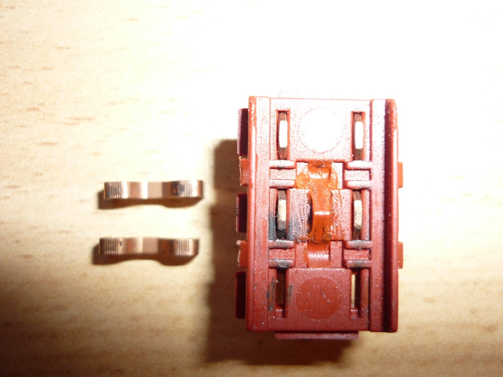 Wenn Du an den vier eingelassenen Kontaktstiften herum schleift, dann funktioniert das Teil auch mit neuen Kontaktplatten nicht mehr. Das ist schon alles sehr genau abgestimmt. Nach dem Reinigen solltest Du nur die Aufnahme für den Schaltschieber, das Ding in der Mitte wieder dünn einfetten. Unbedingt Silikonfett nehmen, sonst schiebt sich der Schalter nicht mehr gut. Das ist auch der Grund, warum Du nicht schleifen sollst, die Mechanik muss zwei gegenläufige Anforderungen erfüllen, guten Kontakt liefern aber auch leichtgängig sein, da reichen wenige Zehntel und es rutscht zwar gut, aber der Kontakt steht nicht mehr fest und neue Schäden an den Kontaktplatten sind vorprogrammiert.