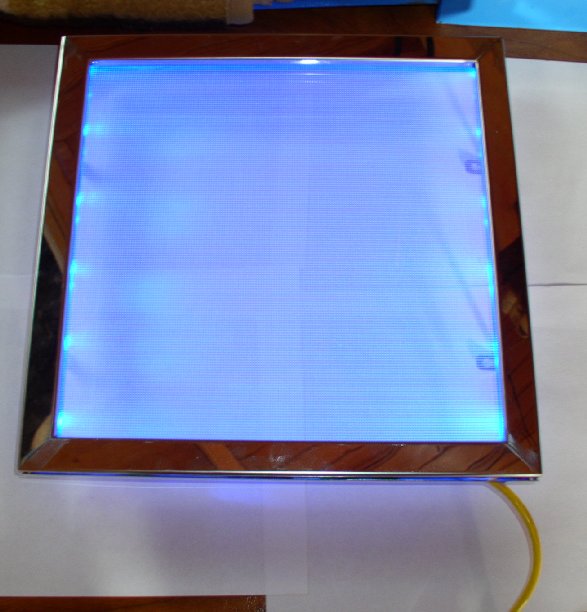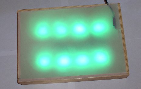 RGB Superflux bestellt, einen Rahmen aus Holz gebaut, LED's aller verlötet und getestet. Doch das Ergebnis war allerdings alles andere als zufriedenstellend. Ich hatte geplant eine Din A4 große Fläche mit den Superflux auszuleuchten in einem Abstand von etwa 6cm, aber die Ausleuchtung war nicht schön gleichmäßig geworden. Bei einem Abstand von etwas über 10cm sah das ganze schon wieder besser aus, allerdings wäre mir die Konstruktion dann einfach zu tief geworden. Also hab ich diese Idee erst mal wieder verworfen.