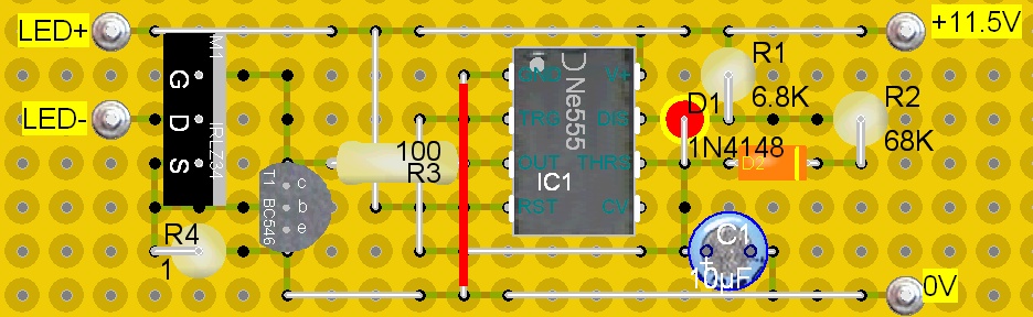 Falls es hier wirklich um 'kleinstmöglichem Raum' geht, dann SMD Bauteile verwenden. In diesem Fall besser einen IRF7401 Mosfet nehmen: https://www.reichelt.de/TLC-555-CD-SMD/ ... IRF%207401 (der ist noch wesentlich besser für kleine Spannungen geeignet als der IRLZ34N) und einen TLC555: https://www.reichelt.de/TLC-555-CD-SMD/ ... ICLE=18886& Der Elko wird leider nicht wirklich klein, aber dieser hier ist relativ klein: https://www.reichelt.de/Elkos-SMD-Low-E ... CLE=109181 (1cm Höhe und 0.8cm Durchmesser) Widerstände mit Bauform 0805: https://www.reichelt.de/SMD-Widerstaend ... 093&SHOW=1 nur der 1 Ohm Widerstand sollte etwas mehr Leistung vertragen, also 2 solche parallel: https://www.reichelt.de/SMD-1206-0-0-Oh ... ICLE=18270auf kleinstmöglichem Raum