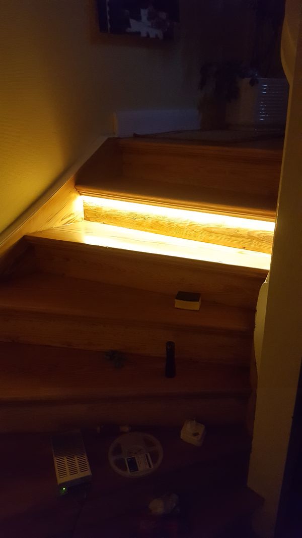 Ich würde an jeder Stufe ein kleines Loch bohren und die Kabel auf der Rückseite der Treppe (Kellerbereich) zusammenführen können. Am liebsten würde ich das ganze über zwei kleine Bewegungsmelder steuern, sobald jemand oben oder unten das Treppenhaus betritt geht die Beleuchtung für Zeit x an. Ein cooler Betriebsmodus wäre auch das die LEDs ständig auf ein Minimum gedimmt an sind und nach Bewegungserkennung heller werden.