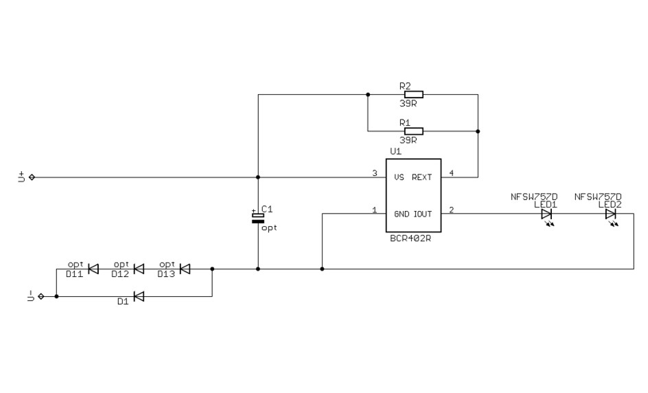 Vielleicht auch nur um es mal zu testen die Schaltung überbrücken und nur mit Vorwiderstand betreiben?