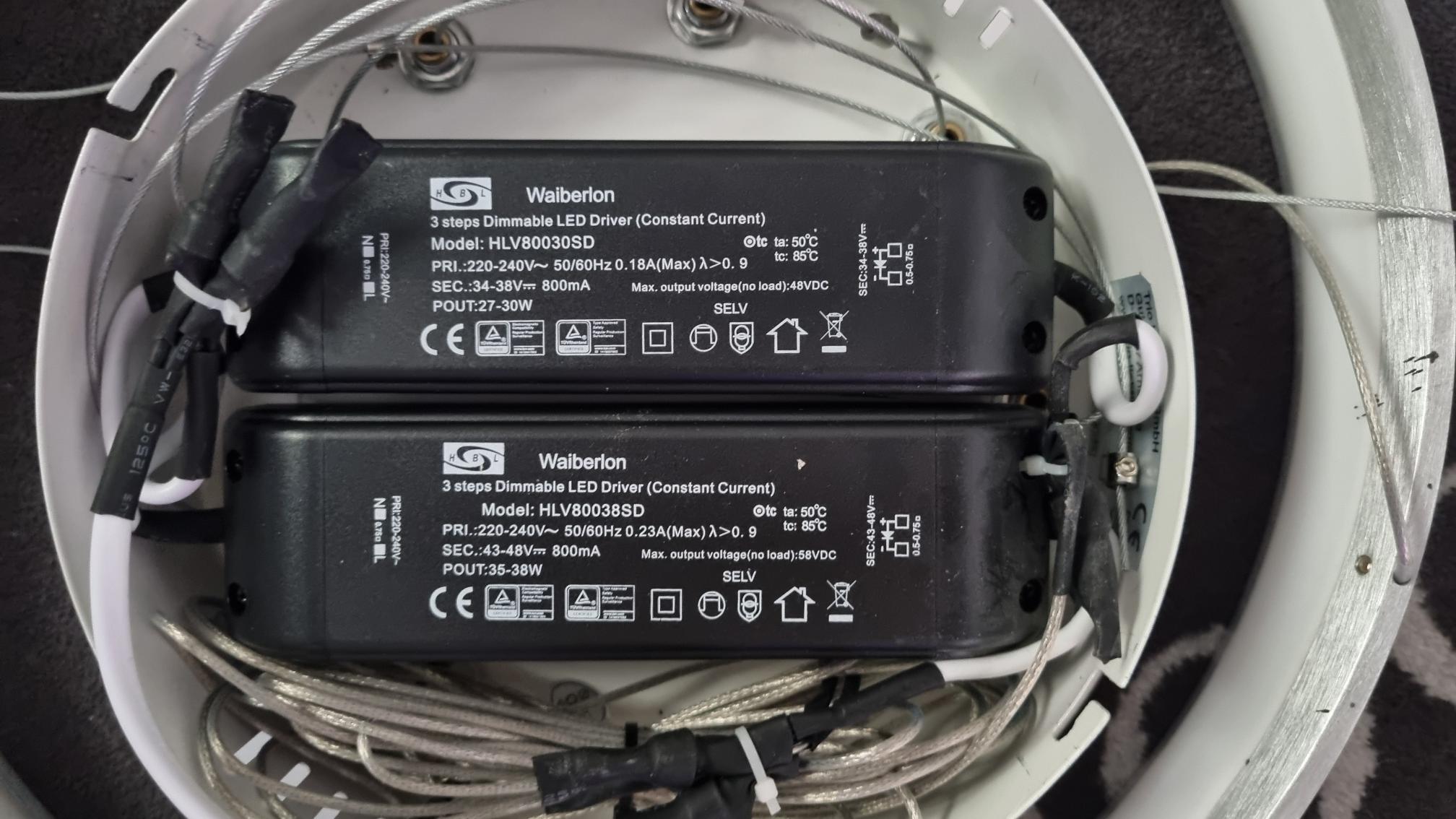 Es ist eine 3-flutige-Leuchte. Die beiden inneren Ringe werden über den 35-38Watt Driver versorgt, der äußere Ring, welcher ab und zu das flackern anfängt, über den 27-30Watt Driver. Wäre es möglich beide Diver gegen einen neuen zu tauschen? Die Ausgangspannungen sind allerdings unterschiedlich, was dann vermutlich bescheiden aussieht.