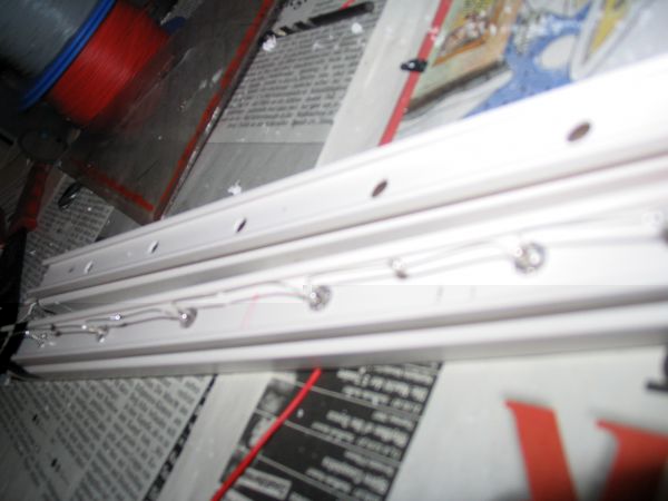 Hier die schon in 3er Reihen verlöteten LEDs, die roten Striche dienten mir, damit ich nicht ausversehen zuviele LEDs an einander löte (ist mir bei der 2ten leiste passiert, seit dem mach ich die striche)