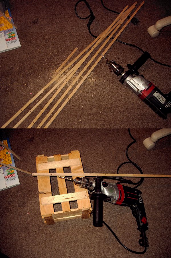 Also in die Holzleisten(insgesamt 6m lang) habe ich alle 20cm 5mm Löcher gebohrt:
