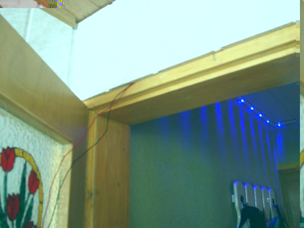 In einer kurzen Leisten 7 Löcher gebohrt für die blaue LEDs, davon habe ich 1 X 3 und 2 X 2 LEDs in reihe geschaltet.